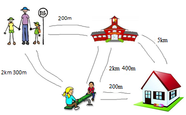 SOLUTION 1 : Step 1, bus stop to school: 600 m Step 2, school to playground: 1 km 200 m Step 3, playground to home: 700 m Step 4, total distance: 600 m + 1 km 200 m + 700 m = 2 km 500 m The total distance travelled is 2 km 500 m. |