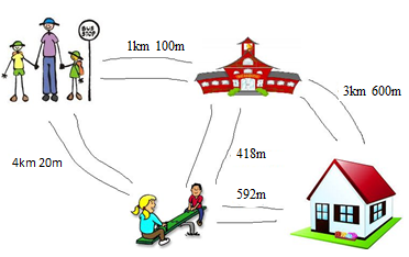 Answer: 1 km Answer: 900 m SOLUTION 1 : Step 1, bus stop to school: 500 m Step 2, school to playground: 1 km 200 m Step 3, playground to home: 200 m Step 4, total distance: 500 m + 1 km 200 m + 200 m = 1 km 900 m The total distance travelled is 1 km 900 m. |
