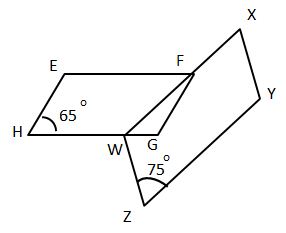 | 5) The figure shown below is not drawn to scale. EFGH and WXYZ are parallelograms. ∠ EHG is 65o and ∠ WZY is 75o. Find ∠ WFG. Answer: 50o SOLUTION 1 :