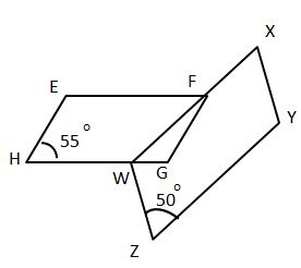 | 4) The figure shown below is not drawn to scale. EFGH and WXYZ are parallelograms. ∠ EHG is 50o and ∠ WZY is 60o. Find ∠ WFG. ![]() o Answer:_______________ |