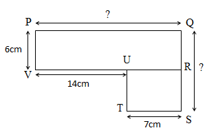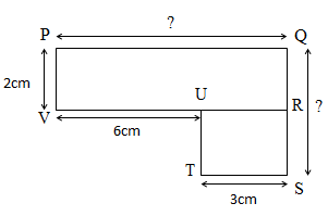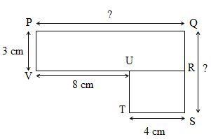 | 7) Figure PQRSTUV is made up of a rectangle and a square. SOLUTION 1 : Step 1: 8 + 4 = 12 cm PQ is 12 cm. Step 2: 3 + 4 = 7 cm QS is 7 cm. |