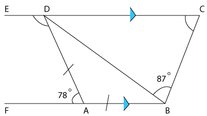 b) Step 1: ∠DAB = 180° - 78° (sum of angles on a straight line) = 102° Step 2:∠ABD +∠ADB = 180° - 102° (sum of angles of triangle) = 78° Step 3: ∠ABD = 78°÷ 2 (isosceles triangle) = 39° Step 4: ∠ABC = 87° + 39° = 126° Step 5: ∠DCB = 180° - 126° (DC // AB) = 54° |